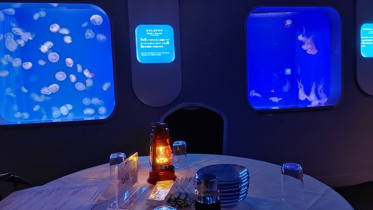 2022-12-07 江の水で忘年会 昨日は私の所属している団体の江ノ島水族館での夜間貸し切り忘年会に参加してきました。 支部会が18:30~19:00 忘年会が19:00~21:00でした。 メイン会場は、当然ながら、大水槽の前 席は入場時の抽選で決まるので、私はクラゲの間になりました。 ギター演奏もありです。 食べたり、飲んだりしたのですが、そっちの写真は取り損ないました。 江の水でこんなことが出来るとは、知りませんでした。